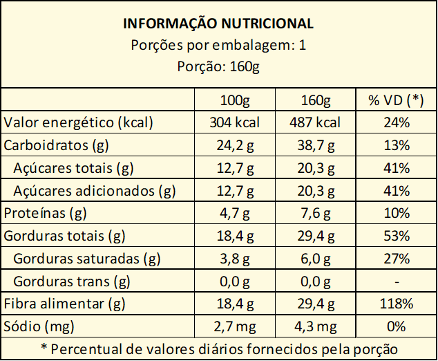 Avelã, creme de leite de arroz (farinha de arroz integral,óleo de coco virgem e goma xantana), açúcar demerara orgânico, chocolate sem lactose e cacau 50%. NÃO CONTÉM GLÚTEN. NÃO CONTÉM LACTOSE. CONTÉM OLEOGINOSAS. PODE CONTER TRAÇOS DE LEITE E OVO.