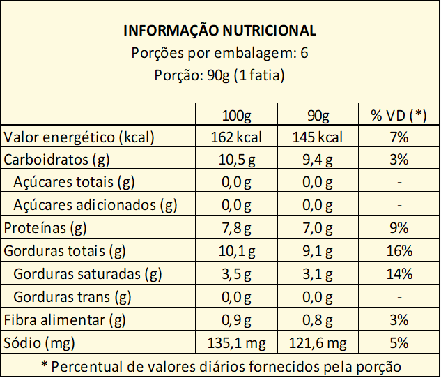 Queijo mussarela zero lactose, cebola, molho de tomate (tomate, cebola, alho, sal e salsa), azeite de oliva extra virgem, alho, alho desidratado, farinha de arroz integral, fécula de batata, azeite de oliva extra virgem, manjericão, amido de milho, fécula de mandioca, farinha de grão de bico, linhaça, psyllium, fermento biológico, orégano, goma xantana e sal. NÃO CONTÉM GLÚTEN. NÃO CONTÉM LACTOSE. PODE CONTER TRAÇOS DE LÁCTEOS, SOJA, OVOS E OLEOGINOSAS.
