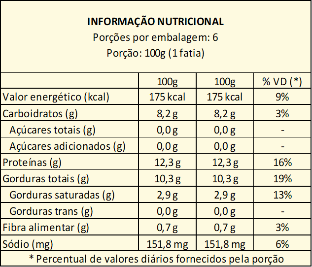 Coração de galinha, queijo vegetal (castanha de caju, aipim orgânico, tremoço, óleo de coco virgem e manteiga de coco), molho de tomate (tomate, cebola, alho, sal e salsa), farinha de arroz integral, fécula de batata, azeite de oliva extra virgem, amido de milho, fécula de mandioca, farinha de grão de bico, linhaça, psyllium, fermento biológico, orégano, goma xantana e sal. NÃO CONTÉM GLÚTEN. NÃO CONTÉM LACTOSE. PODE CONTER TRAÇOS DE SOJA, OVOS, LEITE E OLEOGINOSAS.