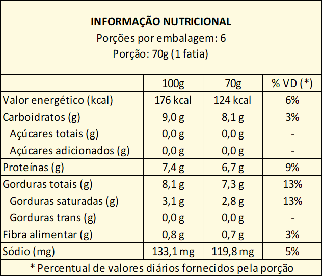Queijo mussarela zero lactose, molho de tomate (tomate, cebola, alho, sal e salsa), farinha de arroz integral, fécula de batata, azeite de oliva extra virgem, amido de milho, fécula de mandioca, farinha de grão de bico, linhaça, psyllium, fermento biológico, goma xantana e sal. NÃO CONTÉM GLÚTEN. NÃO CONTÉM LACTOSE. CONTÉM LEITE (ZERO LACTOSE). PODE CONTER TRAÇOS DE SOJA, OVOS E OLEOGINOSAS.