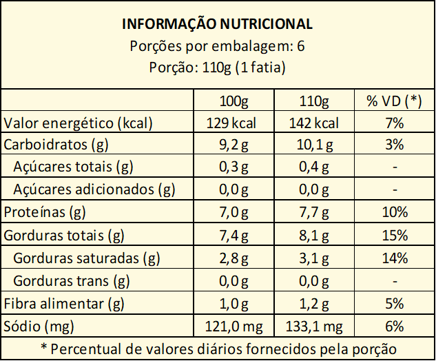 Cogumelo shitake orgânico, queijo vegetal (castanha de caju, aipim orgânico, tremoço, óleo de coco virgem e manteiga de coco), molho de tomate (tomate, cebola, alho, sal e salsa), farinha de arroz integral, alho poró, pimenta biquinho, fécula de batata, azeite de oliva extra virgem, amido de milho, fécula de mandioca, farinha de grão de bico, linhaça, psyllium, fermento biológico, goma xantana e sal. NÃO CONTÉM GLÚTEN. NÃO CONTÉM LACTOSE. PODE CONTER TRAÇOS DE SOJA, OVOS, LEITE E OLEOGINOSAS.