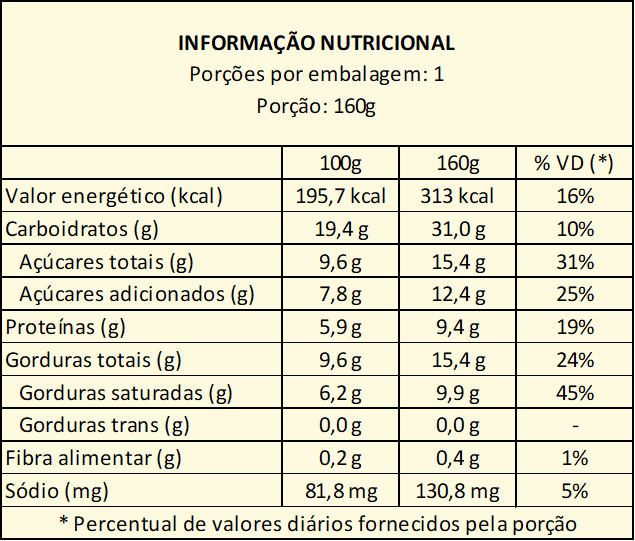Ricota zero lactose, creme de leite zero lactose, biscoito zero glúten (Farinha integral de arroz, açúcar mascavo orgânico, manteiga ghee, ovo caipira, fécula de batata, fécula de mandioca, amido de milho, extrato de baunilha, goma xantana e bicarbonato de sódio), leite em pó zero lactose, leite condensado zero lactose, licor de cacau, café e cacau. NÃO CONTÉM GLÚTEN. NÃO CONTÉM LACTOSE. CONTÉM LEITE ZERO LACTOSE E OVOS. PODE CONTER TRAÇOS DE SOJA E OLEOGINOSAS.